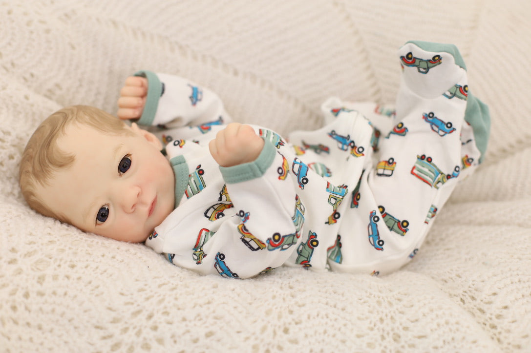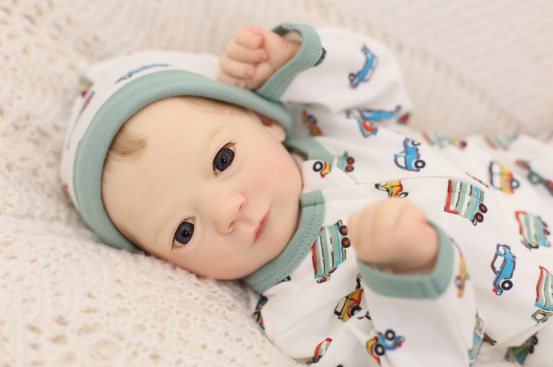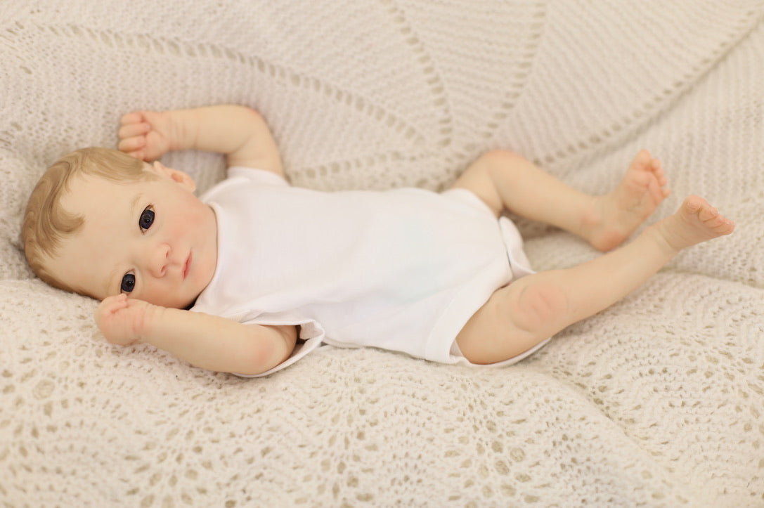 He has been hand painted at Aliyah's Playborn World by our team of talented reborn artists. Many, many layers of paint have brought this precious baby to life, making him look and feel just like a real baby.