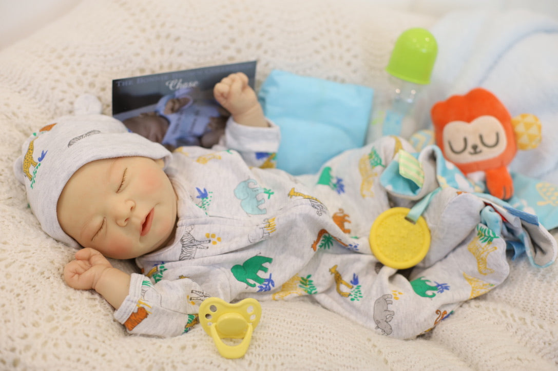He's ready for adoption and will come with with the outfit he is wearing, a magnetic dummy/ pacifier, two nappies/diapers, toy, bottle, blanket, Certificate of Authenticity and Birth Certificate.