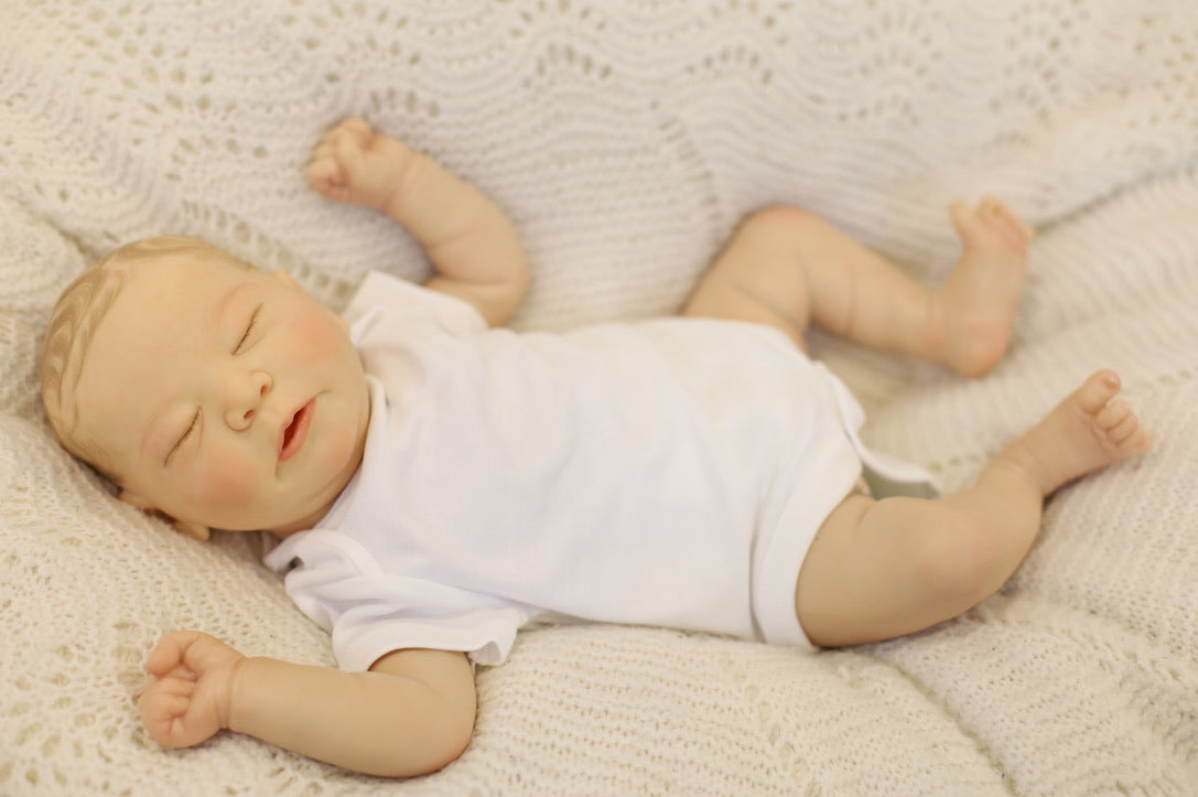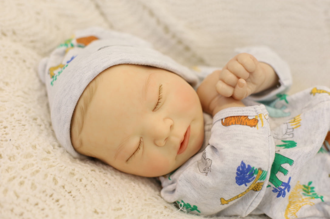 He has been hand painted at Aliyah's Playborn World by our team of talented reborn artists. Many, many layers of paint have brought this precious baby to life, making him look and feel just like a real baby.