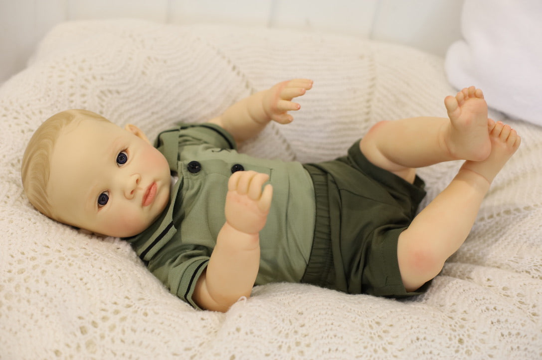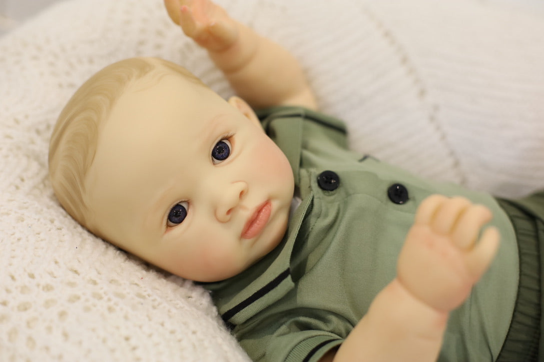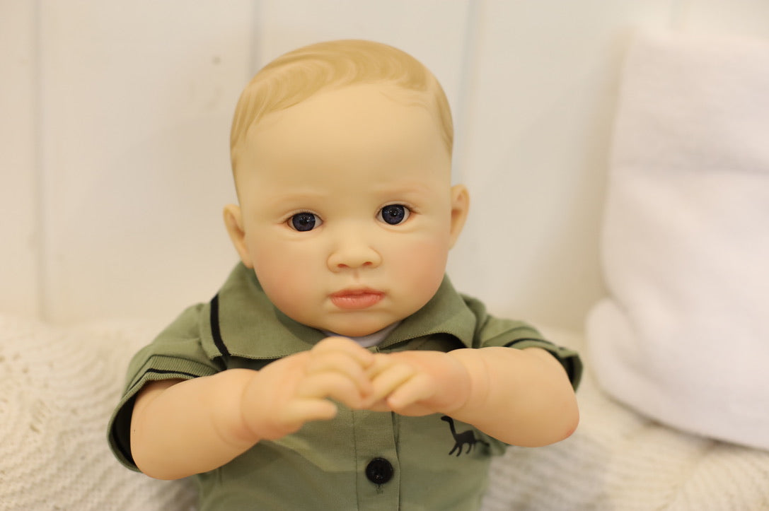 He has been hand painted at Aliyah's Playborn World by our team of talented reborn artists. Many, many layers of paint have brought this precious baby to life, making him look and feel just like a real baby.