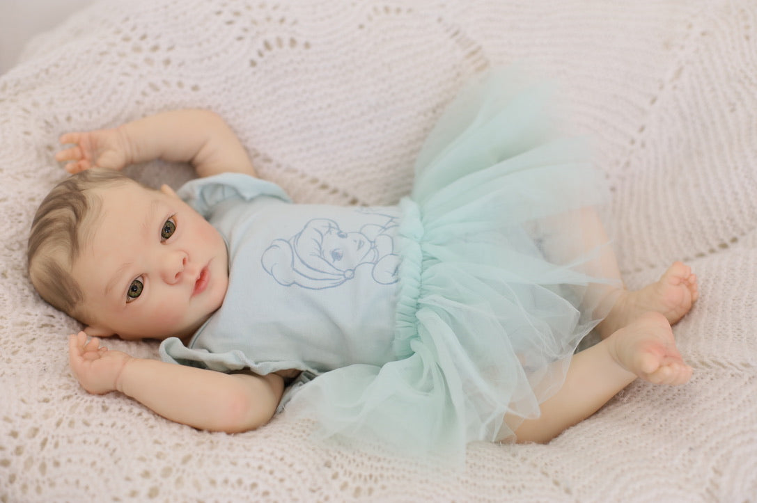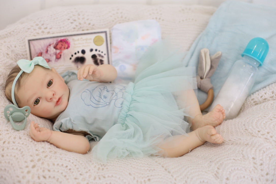 She has been hand painted at Aliyah's Playborn World by our team of talented reborn artists. Many, many layers of paint have brought this precious baby to life, making her look and feel just like a real baby.