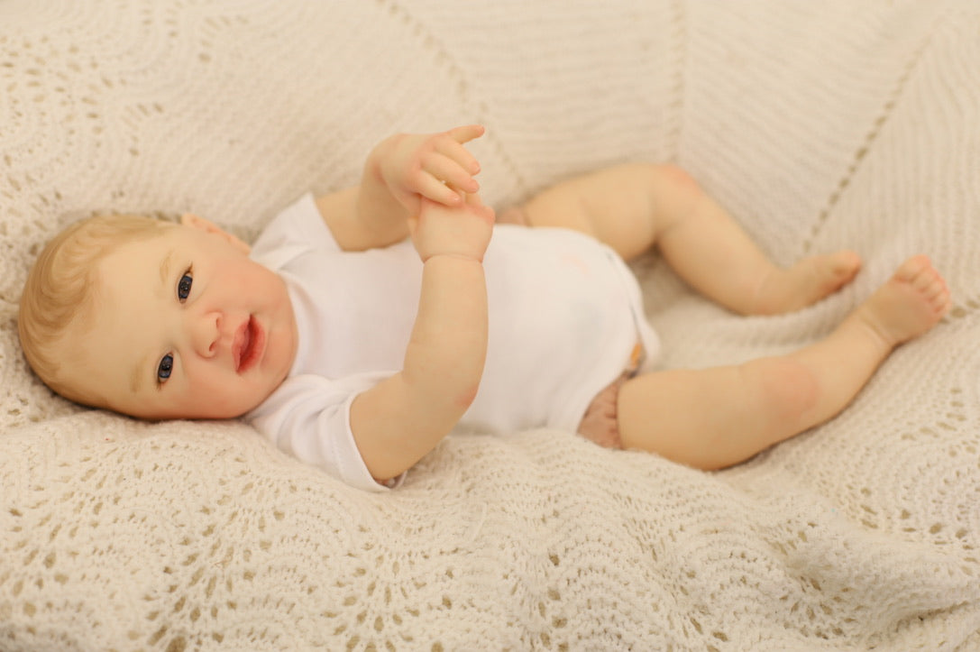 He has been hand painted at Aliyah's Playborn World by our team of talented reborn artists. Many, many layers of paint have brought this precious baby to life, making him look and feel just like a real baby.