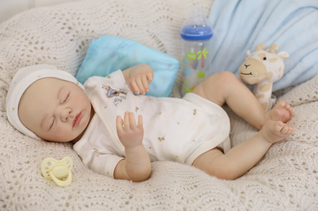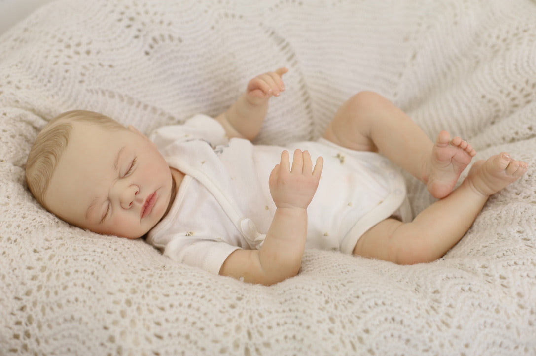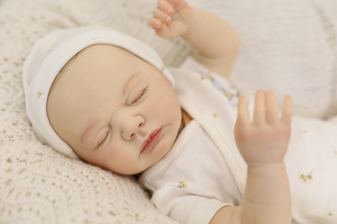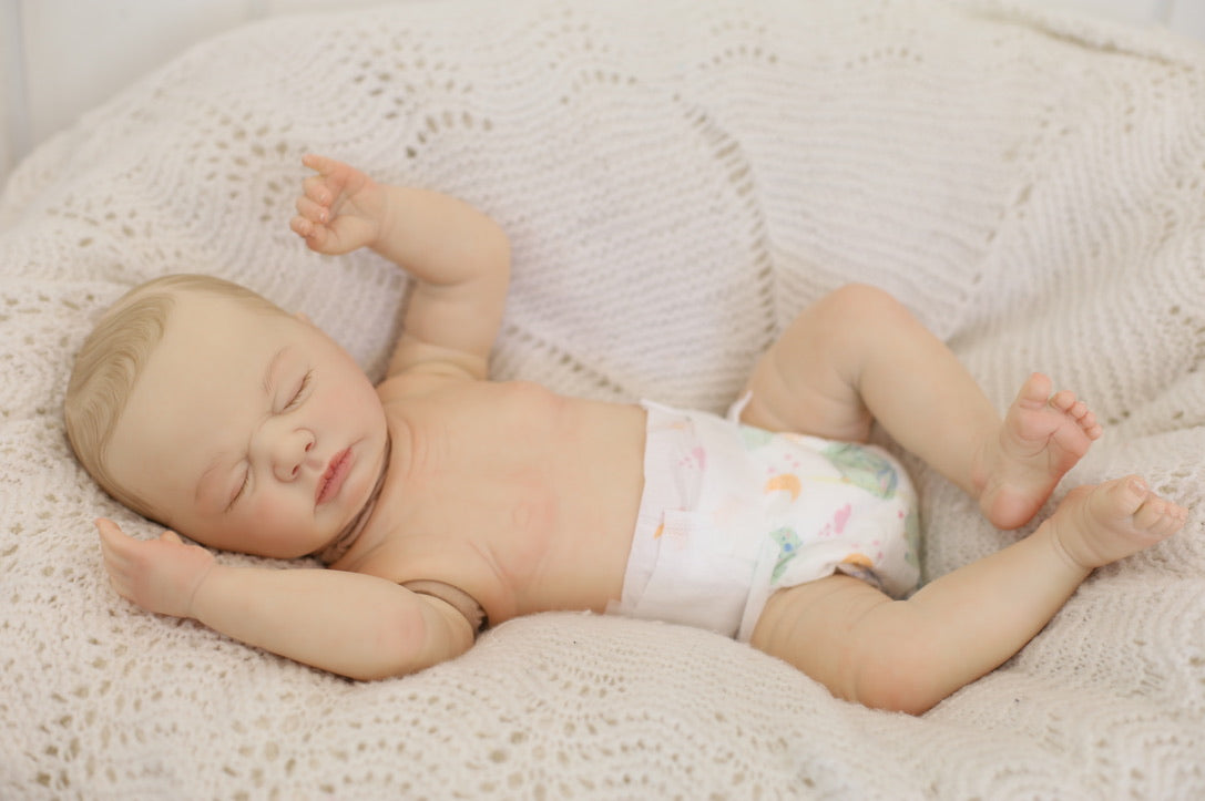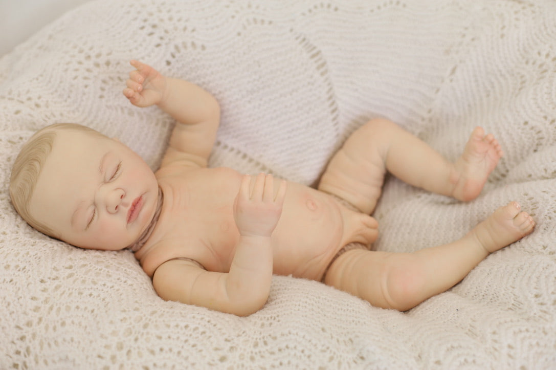 He has been hand painted at Aliyah's Playborn World by our team of talented reborn artists. Many, many layers of paint have brought this precious baby to life, making him look and feel just like a real baby.