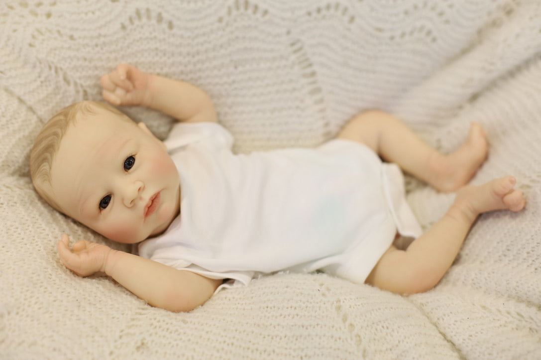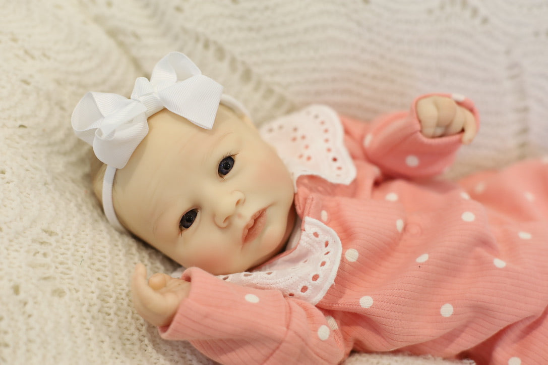 She has been hand painted at Aliyah's Playborn World by our team of talented reborn artists. Many, many layers of paint have brought this precious baby to life, making her look and feel just like a real baby.