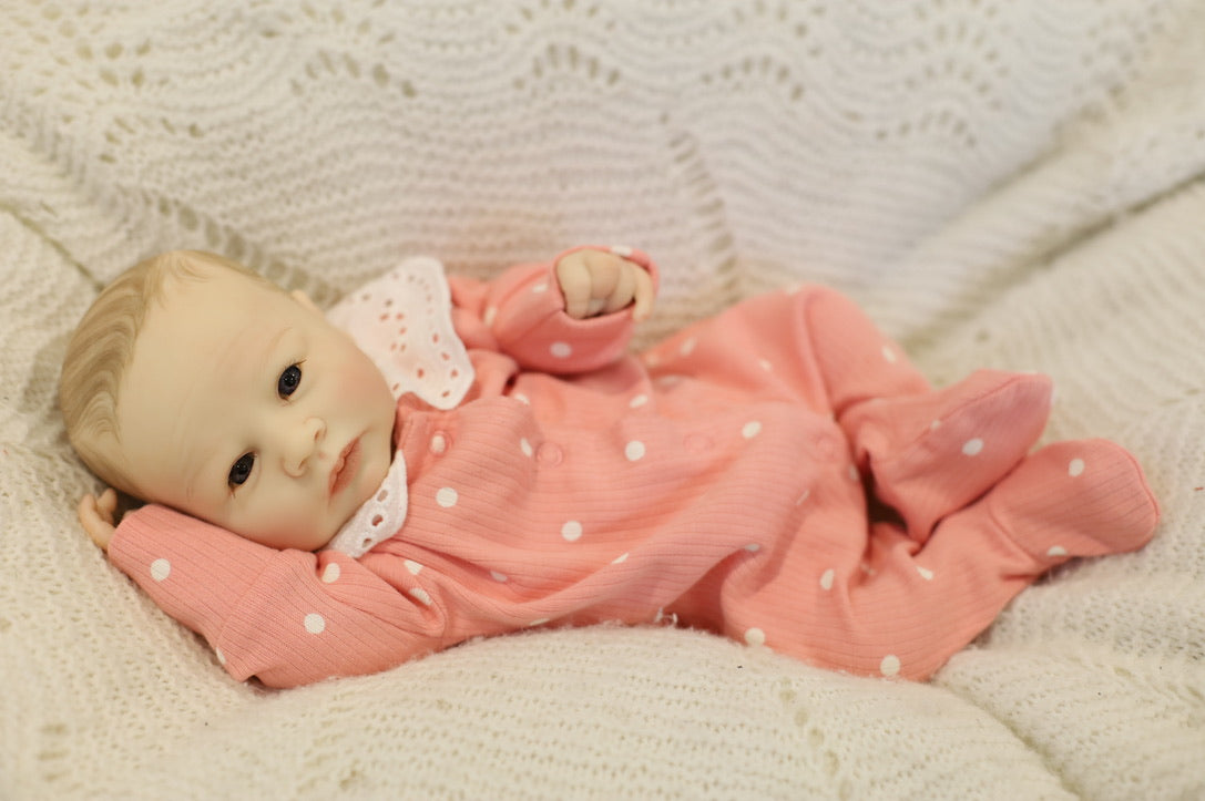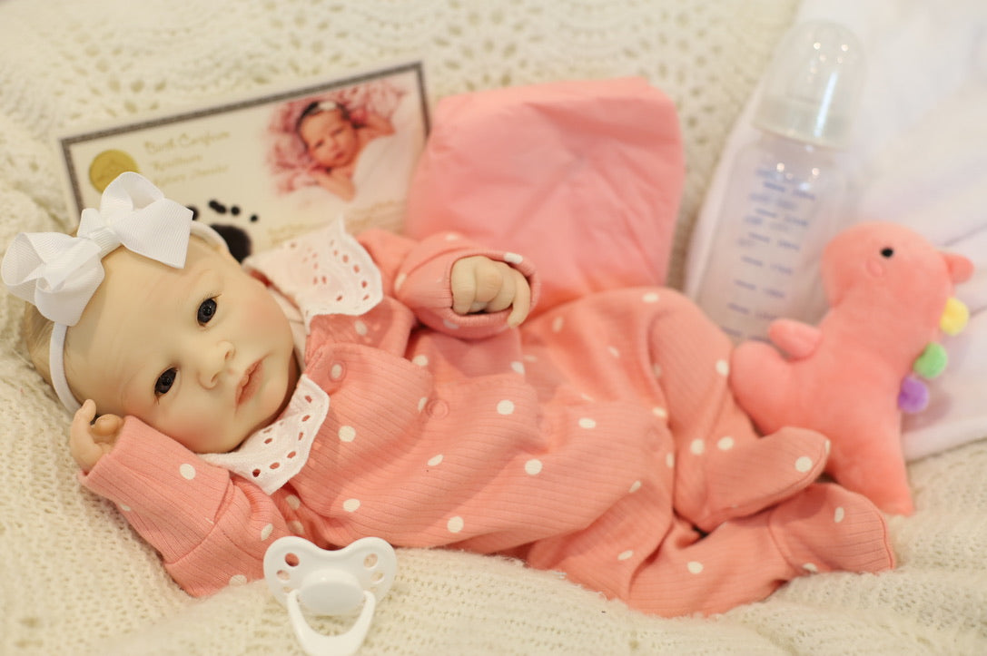 She's ready for adoption and will come with with the outfit she is wearing, a magnetic dummy/ pacifier, two nappies/diapers, toy, bottle, blanket, Certificate of Authenticity and Birth Certificate.