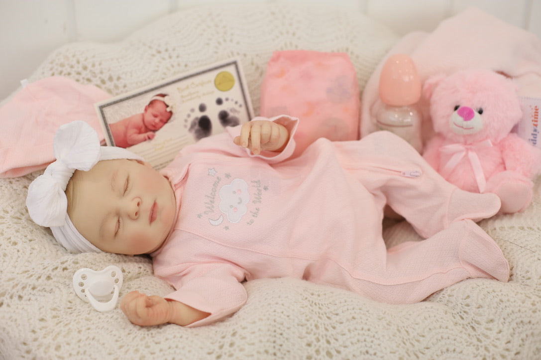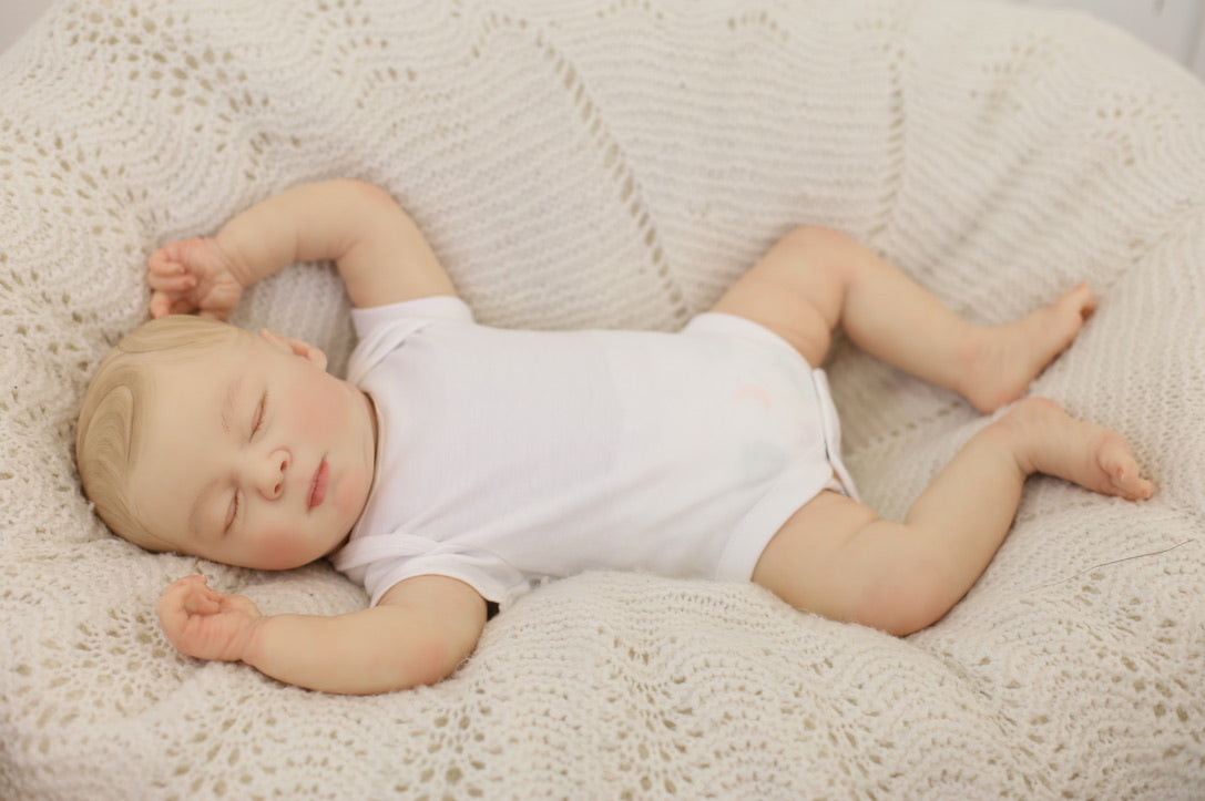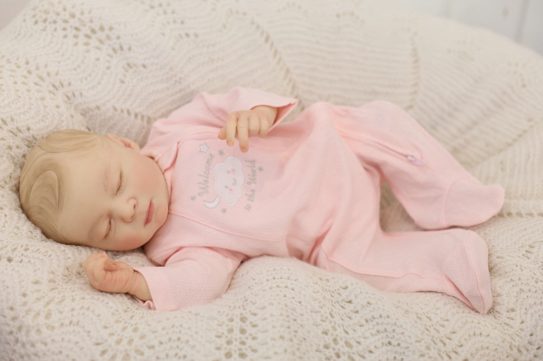 She has been hand painted at Aliyah's Playborn World by our team of talented reborn artists. Many, many layers of paint have brought this precious baby to life, making her look and feel just like a real baby.