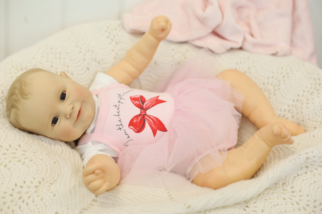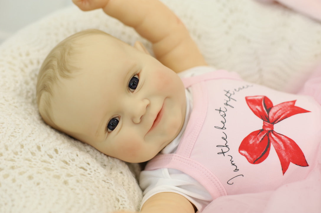 She has been hand painted at Aliyah's Playborn World by our team of talented reborn artists. Many, many layers of paint have brought this precious baby to life, making her look and feel just like a real baby.