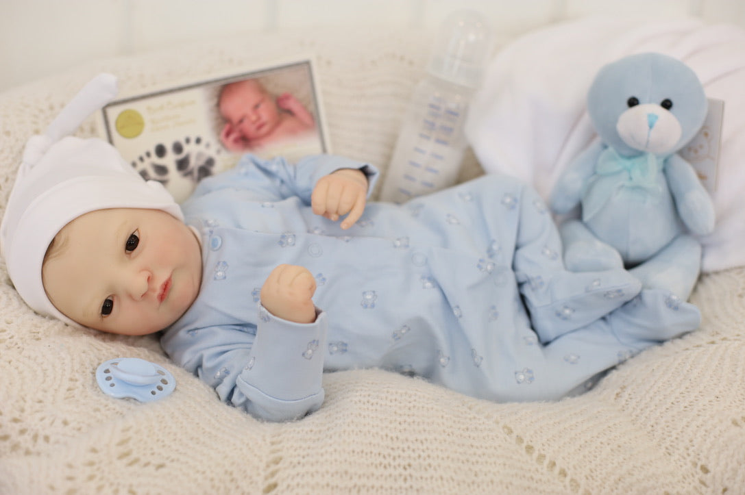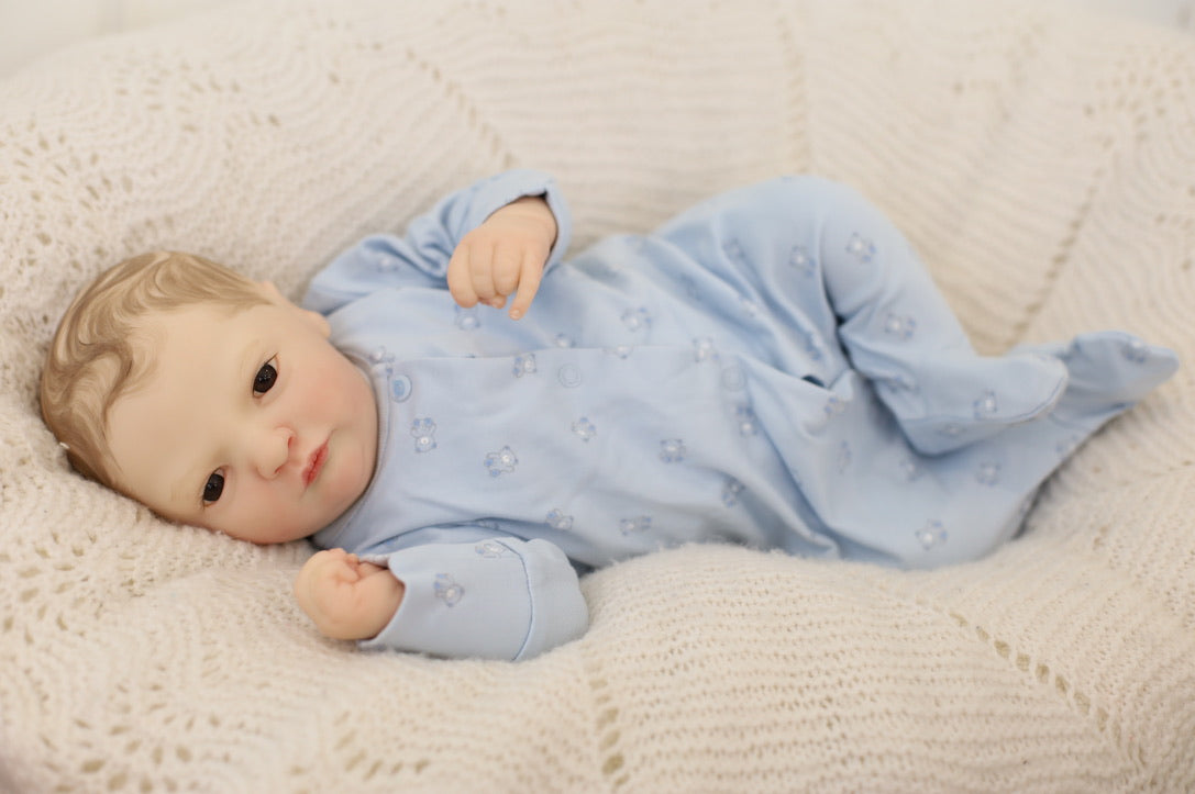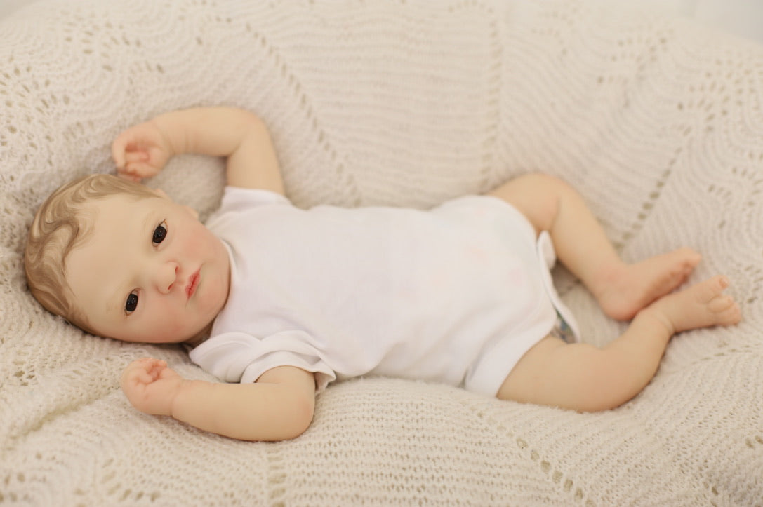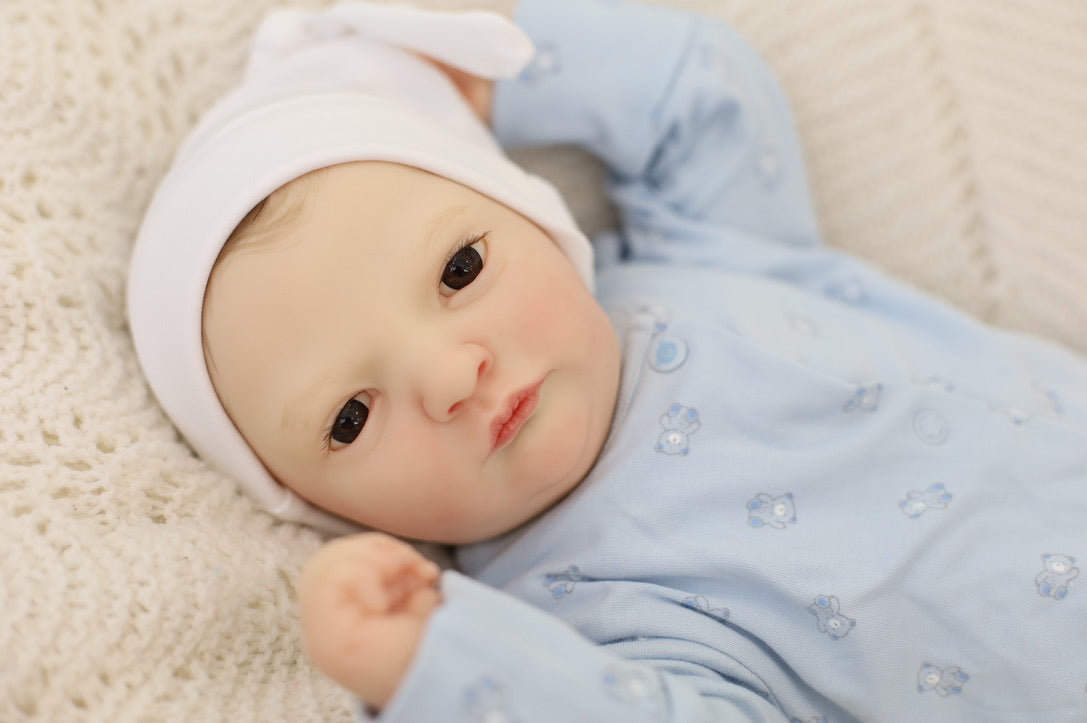 He has been hand painted at Aliyah's Playborn World by our team of talented reborn artists. Many, many layers of paint have brought this precious baby to life, making him look and feel just like a real baby.