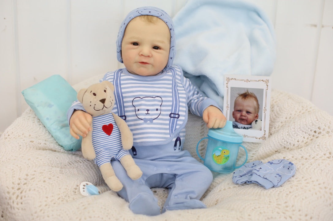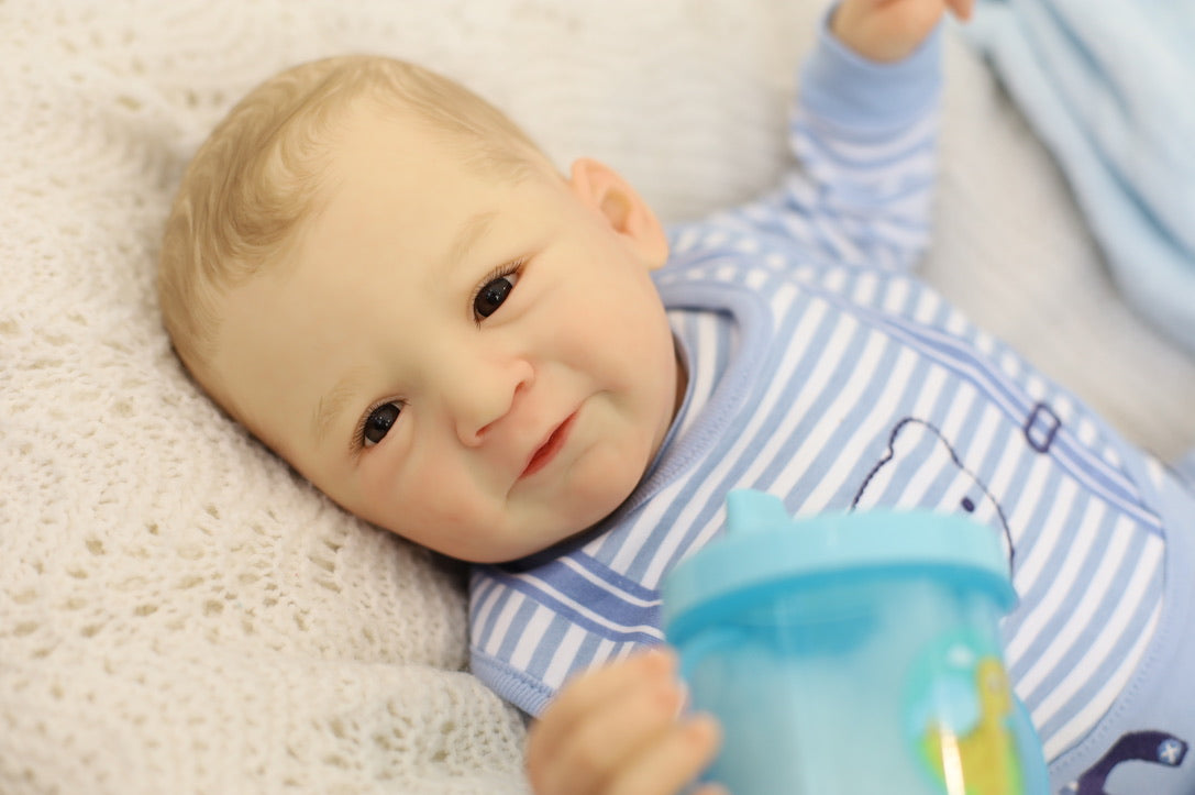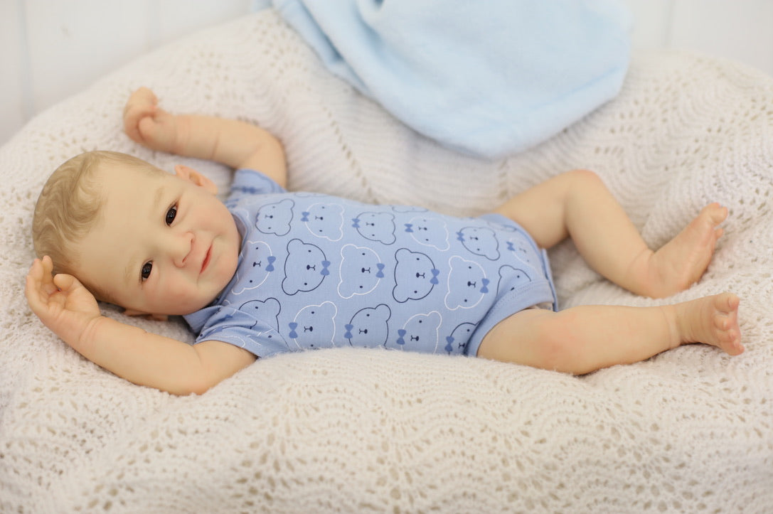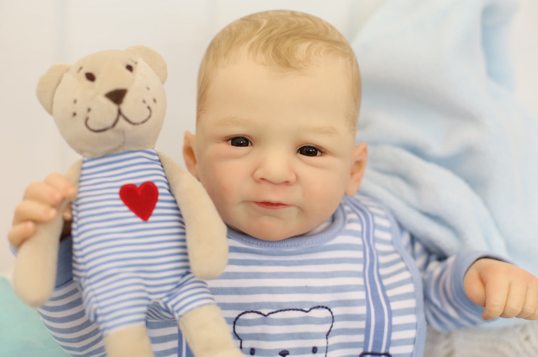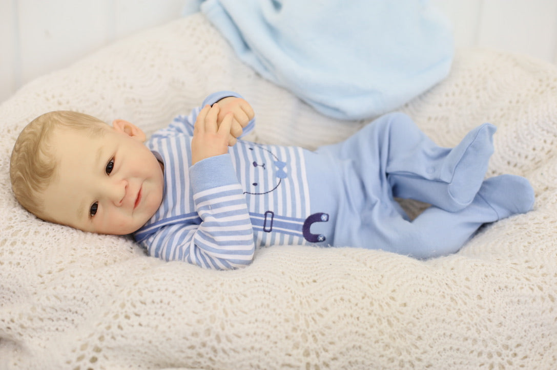 He has been hand painted at Aliyah's Playborn World by our team of talented reborn artists. Many, many layers of paint have brought this precious baby to life, making him look and feel just like a real baby.