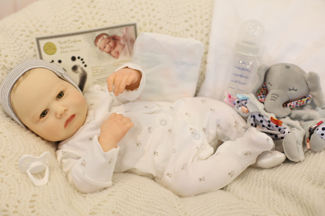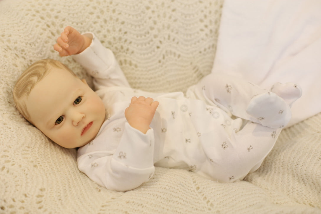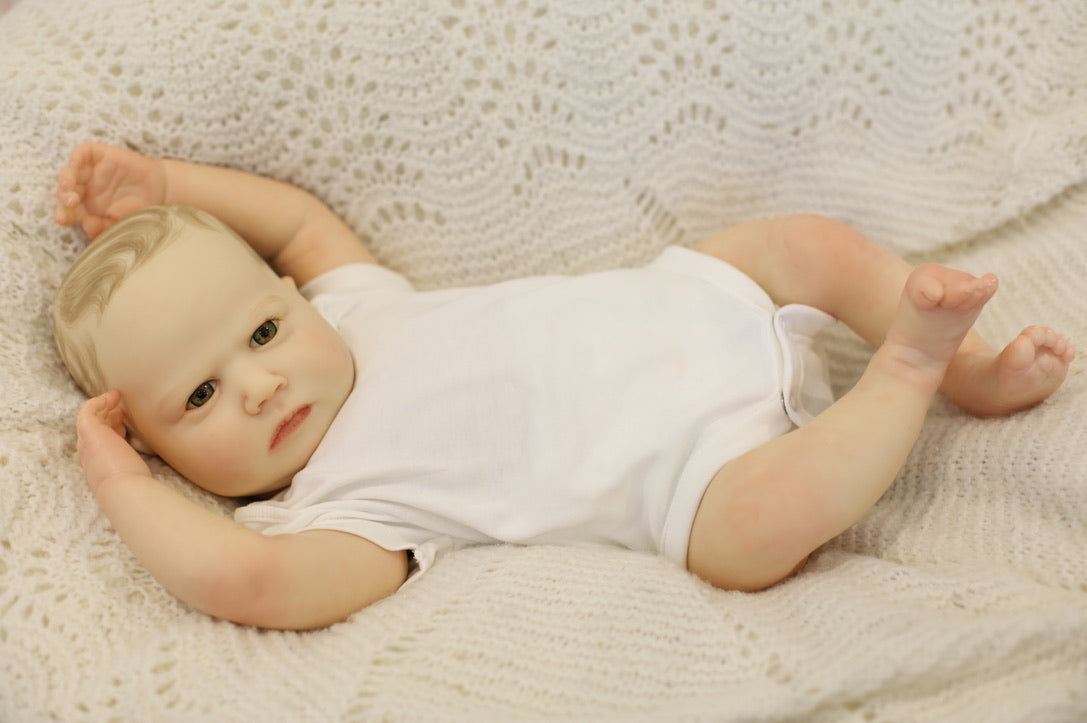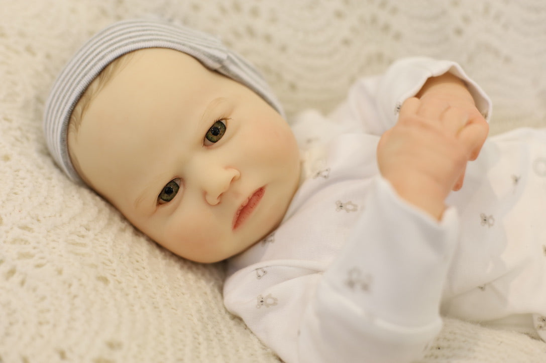 He has been hand painted at Aliyah's Playborn World by our team of talented reborn artists. Many, many layers of paint have brought this precious baby to life, making him look and feel just like a real baby.