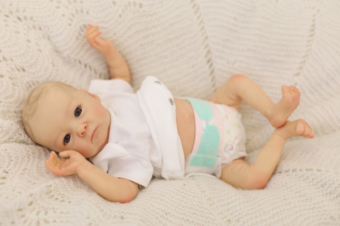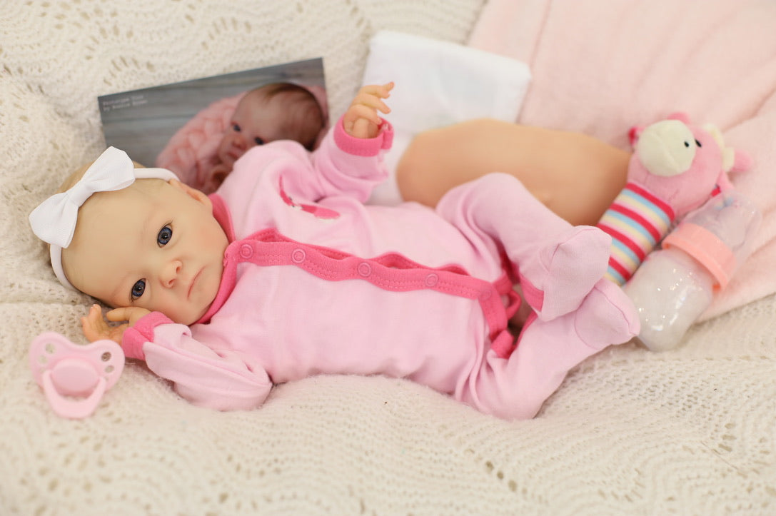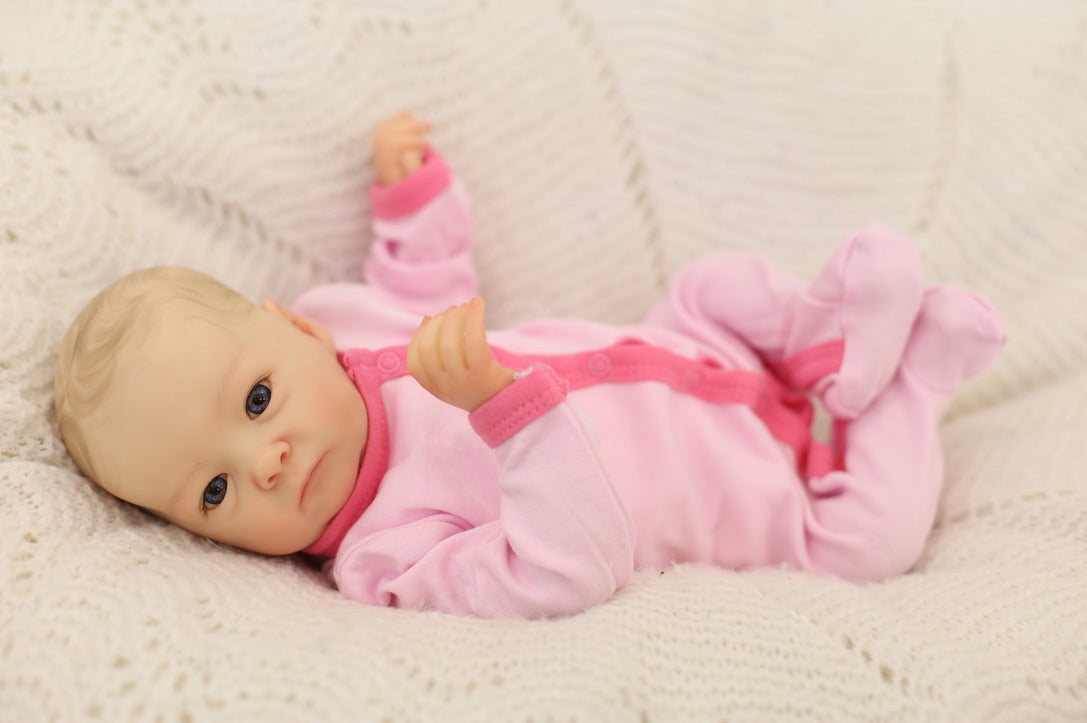 She has been hand painted at Aliyah's Playborn World by our team of talented reborn artists. Many, many layers of paint have brought this precious baby to life, making her look and feel just like a real baby.